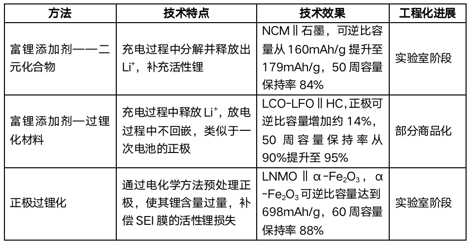 正極預鋰化是指通過額外添加的活性鋰源,來補償不可逆的活性鋰損失,確保電池內活性鋰的充足。相較于流程復雜?安全風險高,且對環(huán)境和工藝要求較高的負極預鋰化技術,目前研究較多的正極預鋰化技術集中在高性價比的富鋰添加劑開發(fā)方面。